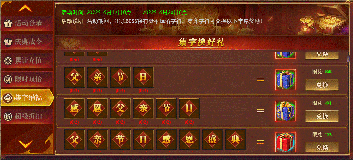活动期间,击杀boss有概率掉落字符和父亲节道具,集齐道具即可兑换下面各种丰厚奖励!