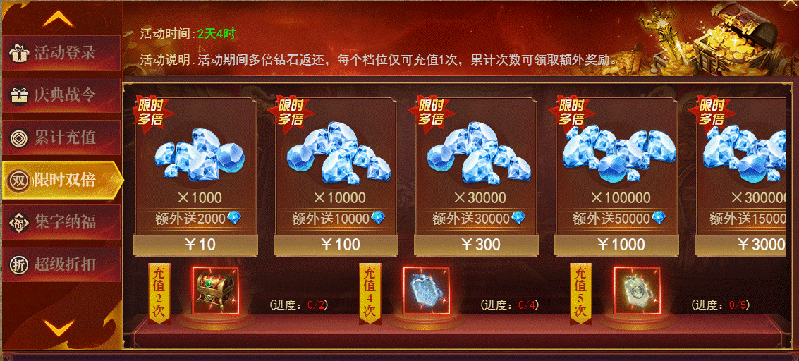 活动期间,在该活动页面充值即可享受多倍钻石返还,每个档次仅可充值1次,累计次数可领取额外奖励。