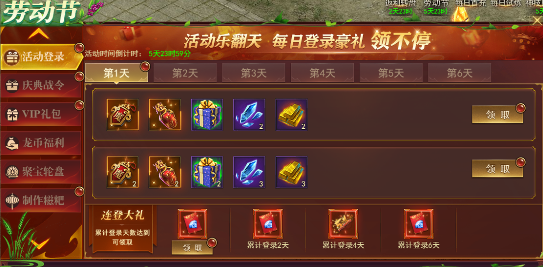 活动期间每日登录即可领取登录奖励,连续登录更可领取连登大礼,更有51称号赠送。