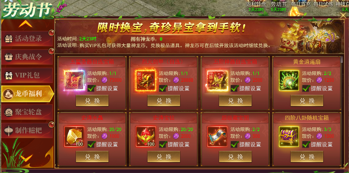 活动期间可通过vip礼包获得大量神龙币,使用神龙币可兑换各种极品道具。