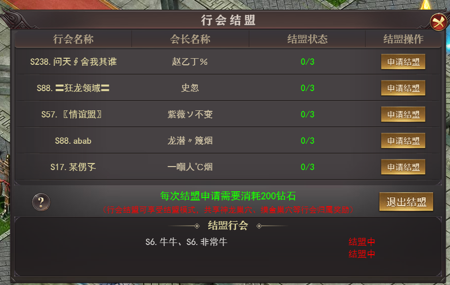 5、结盟数量:结盟行会最多2个行会,超出不可再加入。