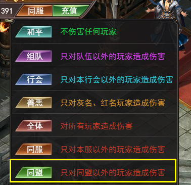 8、结盟模式:选择结盟模式后,不会攻击到同盟的其他行会的玩家。