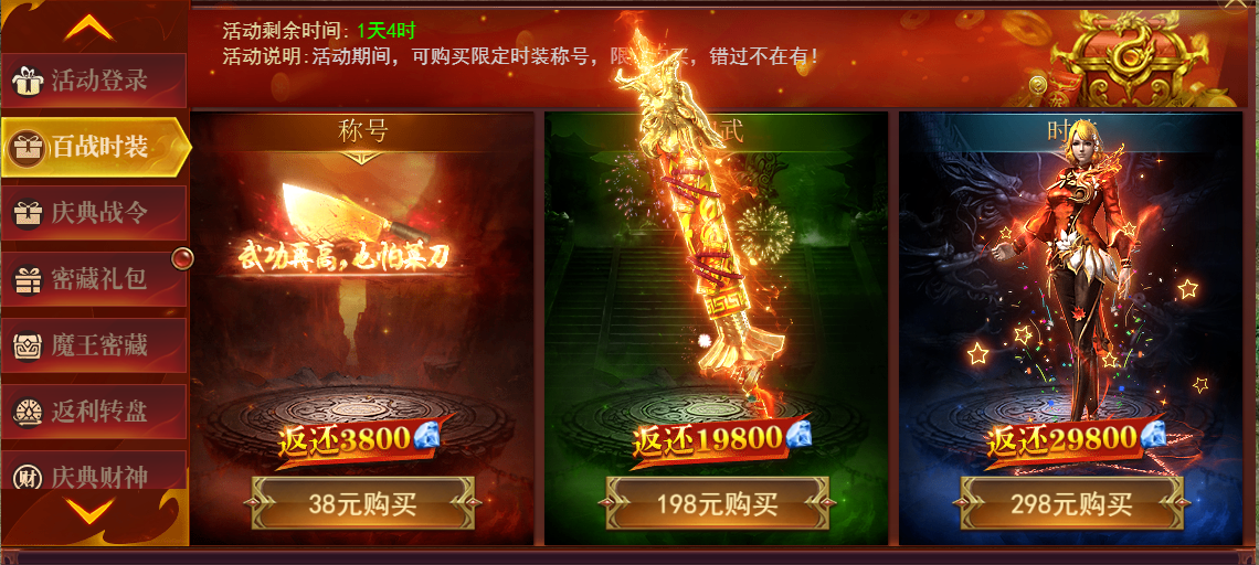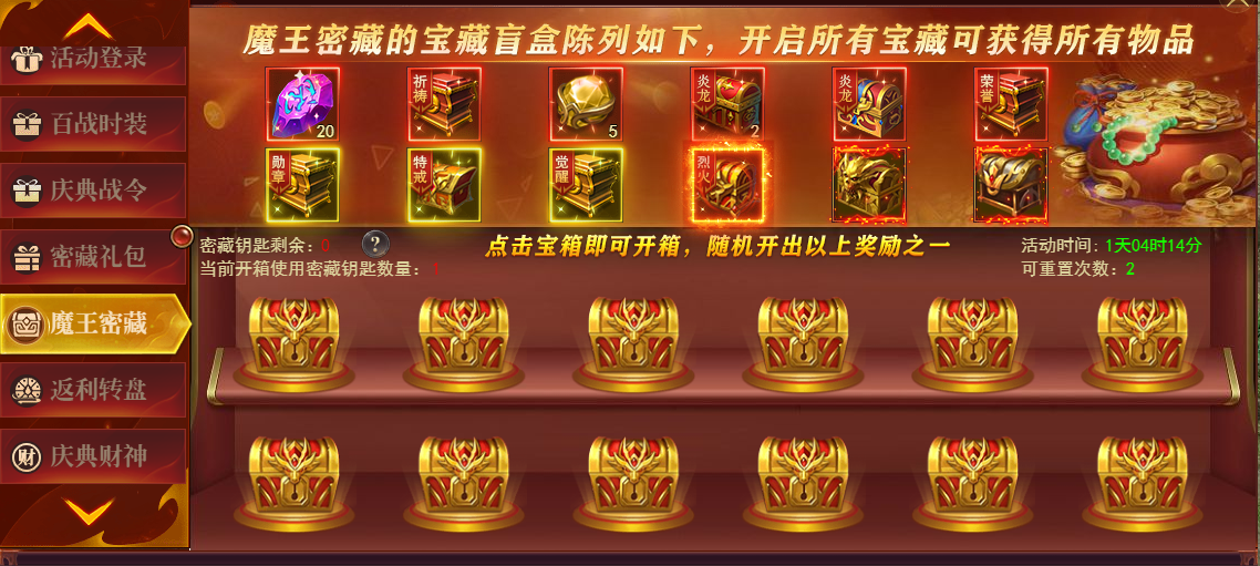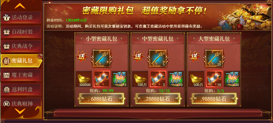 活动期间购买礼包可获得大量密藏钥匙,可在魔王密藏活动中使用获得稀有奖励!