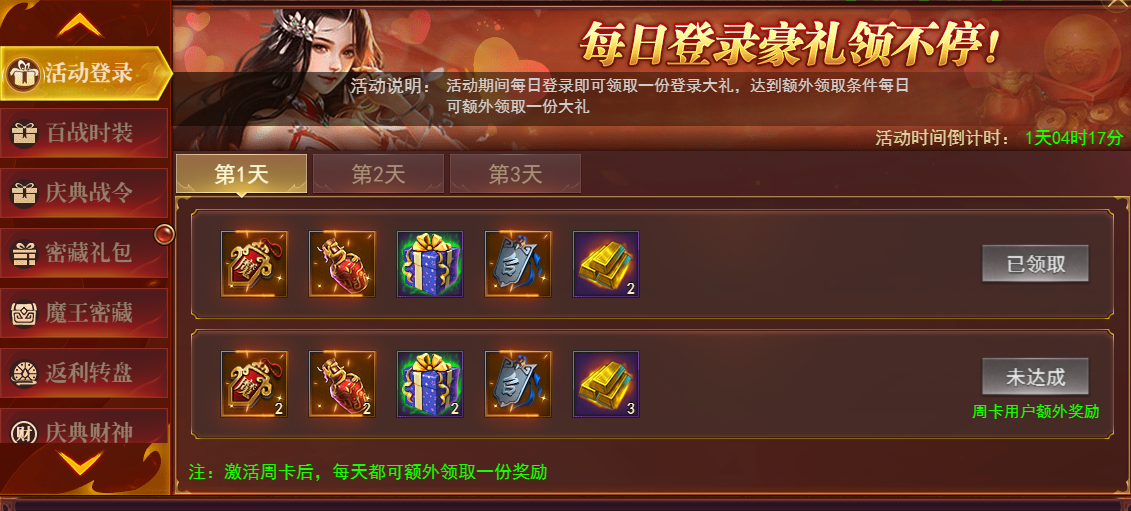 活动期间每日登录可领取一份登录奖励,周卡用户可以在领取一份。