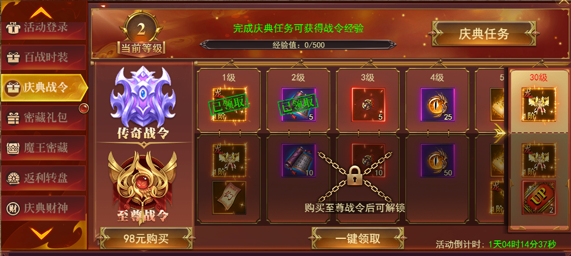 活动期间开放庆典战令,每日只需完成活跃任务即可免费领取大量奖励,额外开通至尊战令获得多倍奖励。