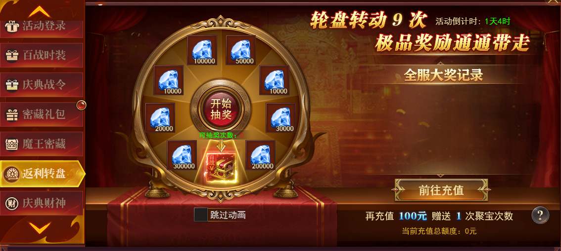 活动期间累计充值达到转盘要求,即可转动一次转盘,超高返利钻石、极品大奖等您拿,转动9次所有大奖全部拿走。