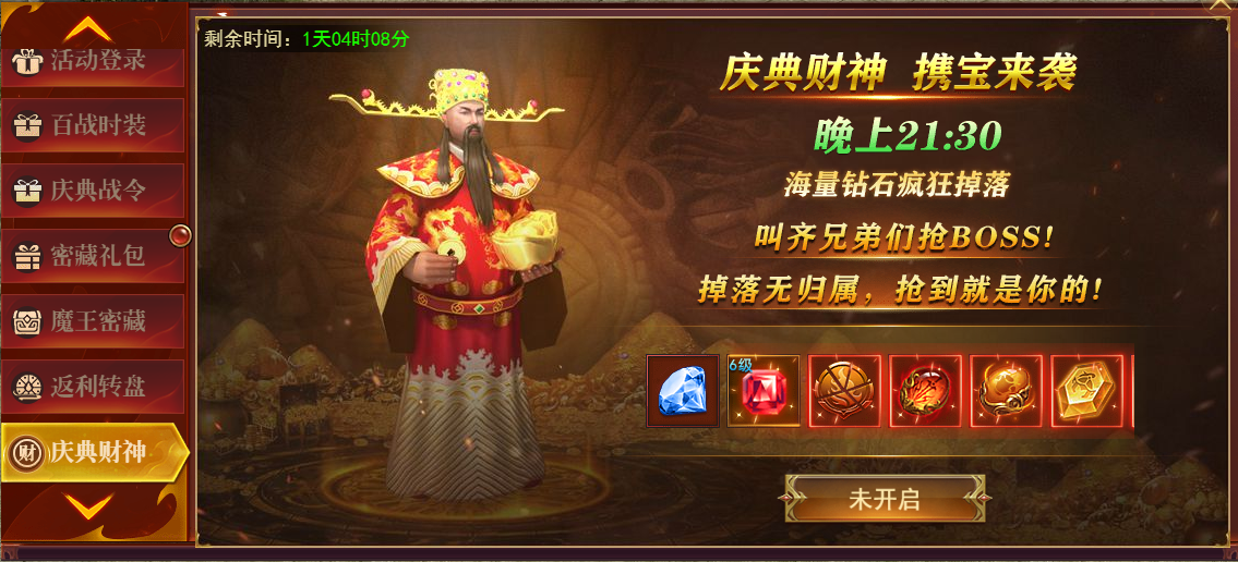 活动期间,每日21:30开放庆典财神入口,财神掉落大量钻石、宝石、火焰特戒碎片、霸业装备碎片等稀有奖励