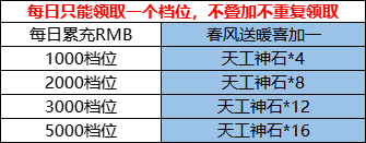 举例:小明单日累计充值4000元,只可选择领取3000档次奖励,天工神石*12