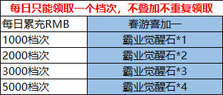 举例:小明单日累计充值4000元,只可选择领取3000档次奖励,霸业觉醒石*3。