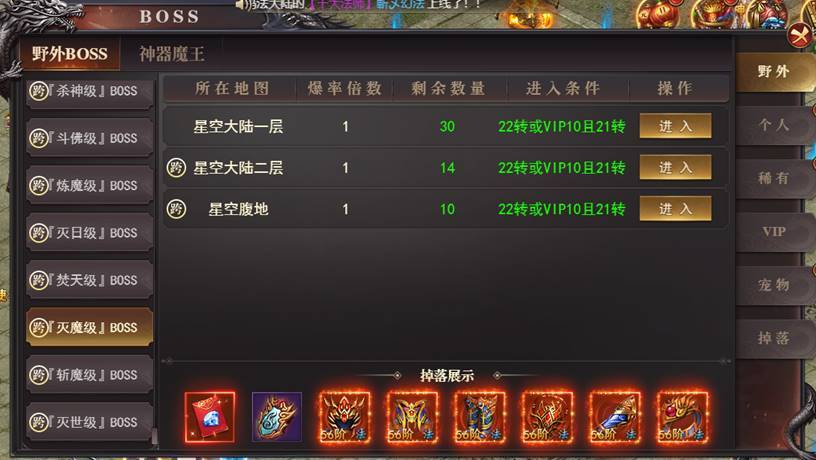 星空大陆的怪物拥有一定焚烧伤害,需要焚烧抗性才可挂机,1层怪物较若,星空大陆越深入难度越大,产出60阶装备。二层和星空腹地每隔一段时间会刷新超级boss,二层超级boss极高概率掉60装备,腹地超级boss必掉60装备