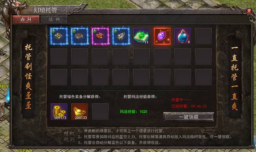 3、领取:托管后掉落的道具会自动放入玛法挂机背包界面,可一键领取到玛法背包。