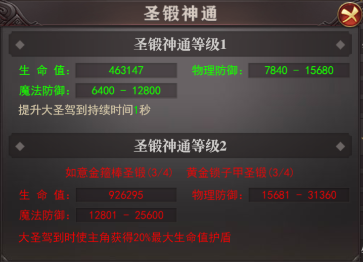 圣锻神通:如意金箍棒圣锻+黄金锁子甲圣锻达到1阶,提升大圣驾到持续时间1秒