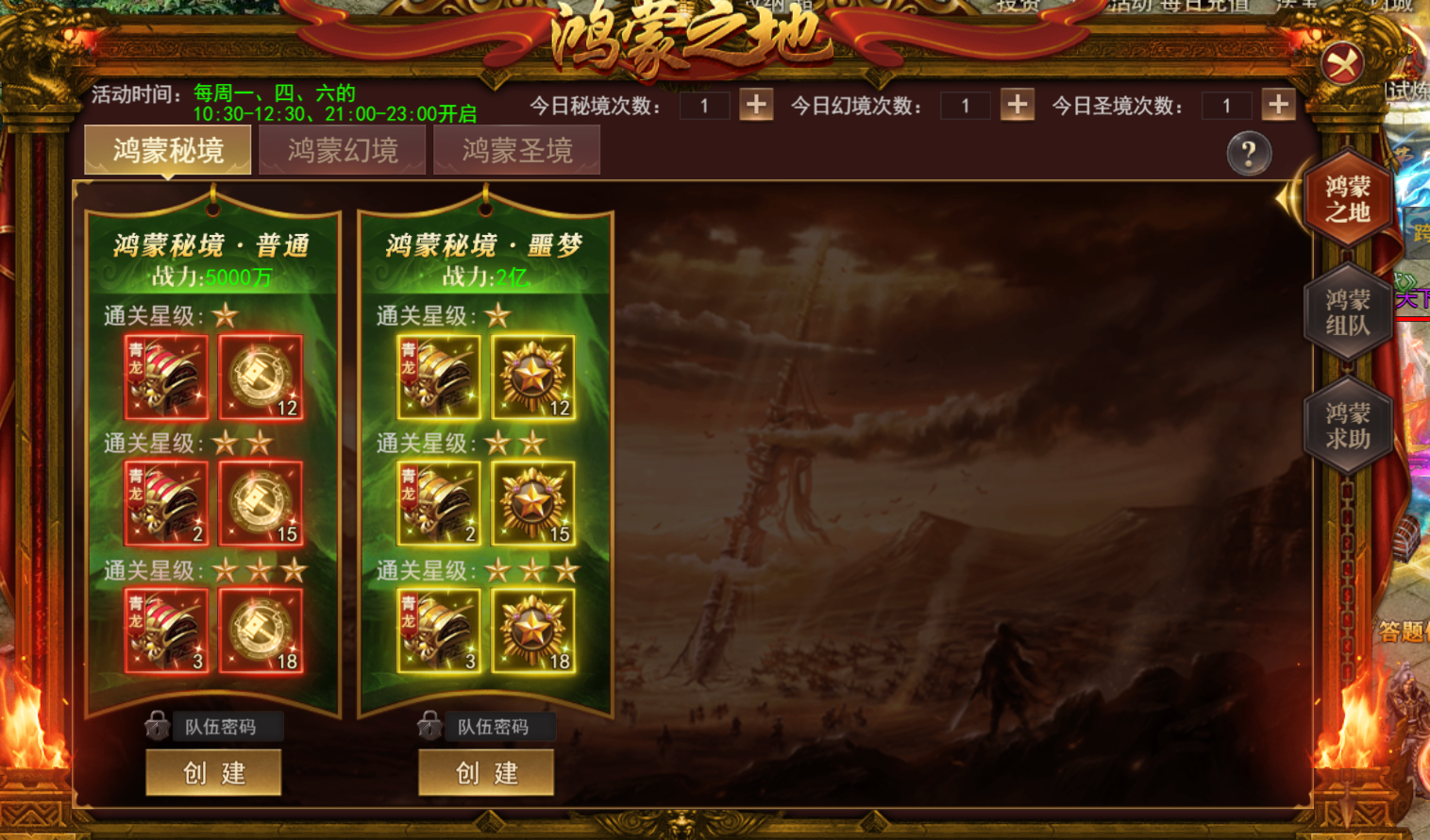 2.副本次数:每一个副本至少组队2人,最多组队6人。可自己创建对应的房间,可设置房间密码。每一个秘境副本每周可以打3次,每次活动可购买2次