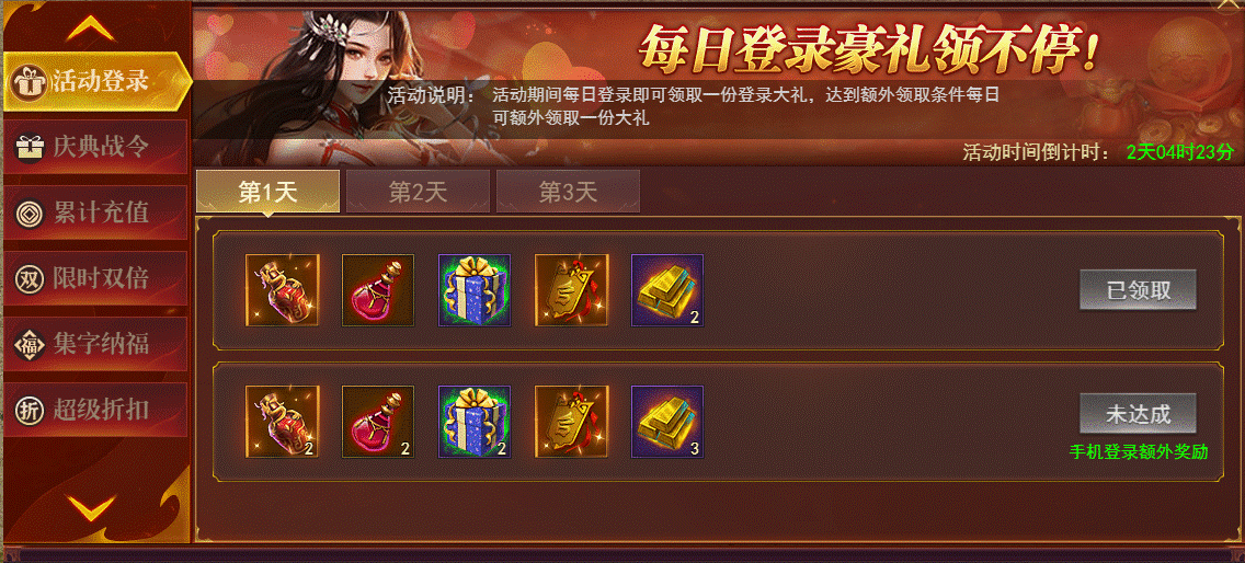 活动期间每日登录可领取一份登录奖励,周卡用户可以在领取一份。