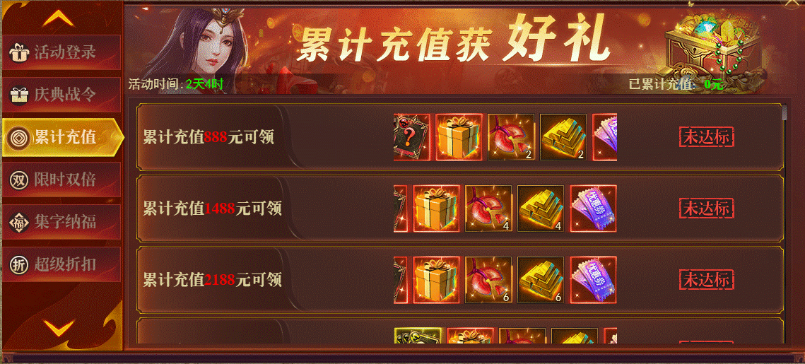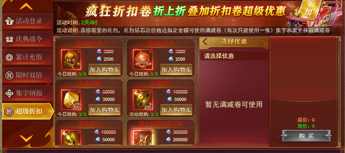 活动期间充值满足要求即可领取豪华奖励,还有满减券赠送,可在超级折扣活动里使用。