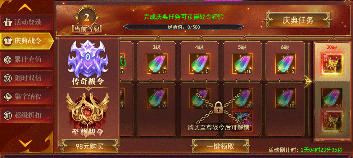 活动期间开放庆典战令,完成活跃任务获得战令经验,战令达到对应等级即可领取传奇战令奖励,开通至尊战令获得更多奖励。