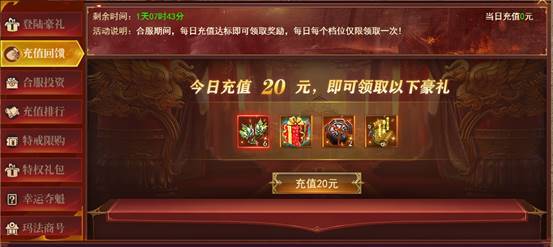 合服期间,每日充值达标即可领取奖励,每日每个档位仅限领一次!