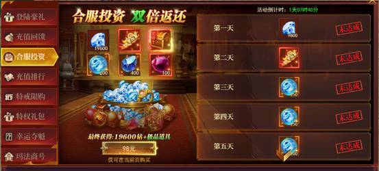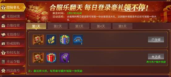 合服期间每日登陆都可领取一份合服登陆大礼,激活周卡还可以额外领取一份大礼
