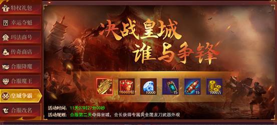 合服第四天夺得皇城,会长获得专属黄金屠龙武器外挂,还有钻石等丰厚奖励