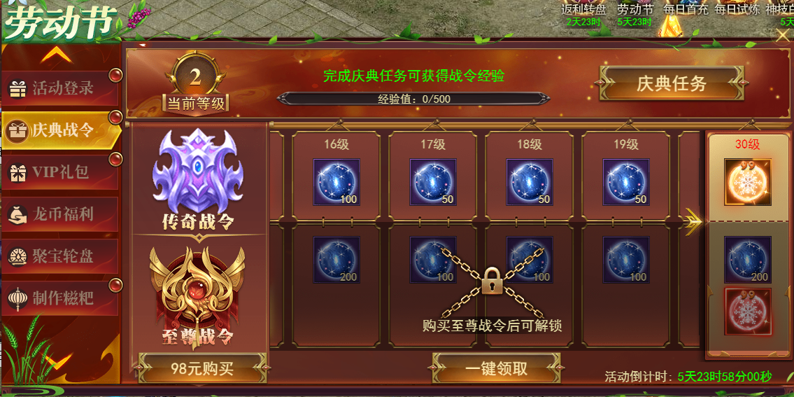 活动期间开放庆典战令,每日只需完成活跃任务即可免费领取大量奖励,开通至尊战令获得更多奖励。
