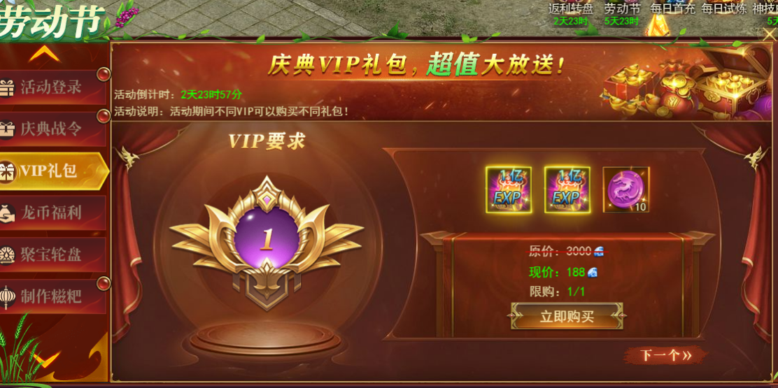 活动期间不同VIP可以购买不同礼包,超低折扣,超划算,机会不容错过。