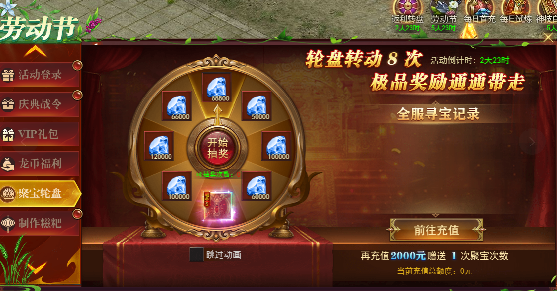活动期间累计充值达满足要求,即可转动一次转盘,超高返利钻石、极品霸业披风等您拿,转动8次所有奖励全部拿走。