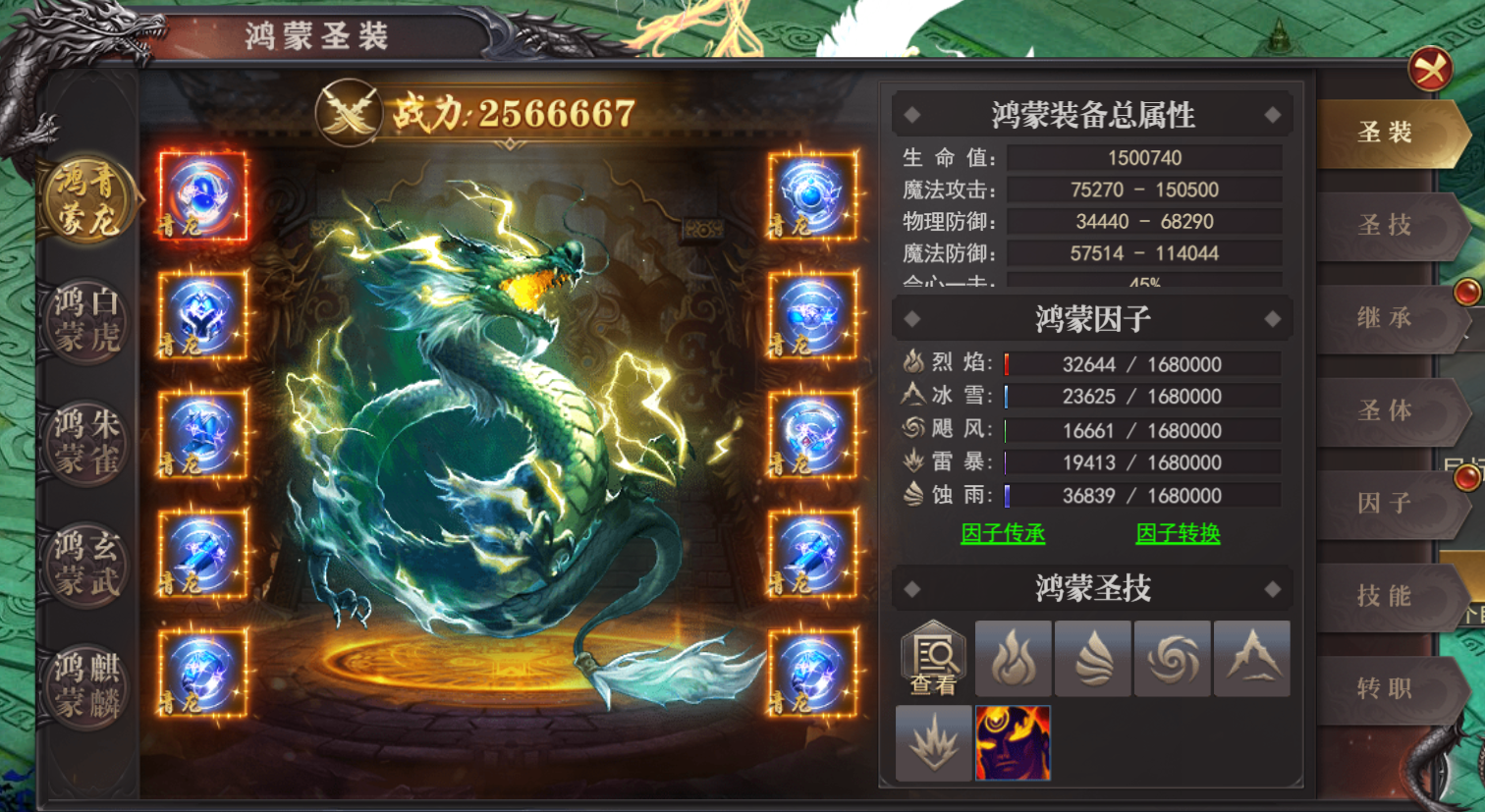 (3)圣装鸿蒙因子最大条数—青龙:1条、白虎:2条、朱雀:3条、玄武:4条、麒麟:5条