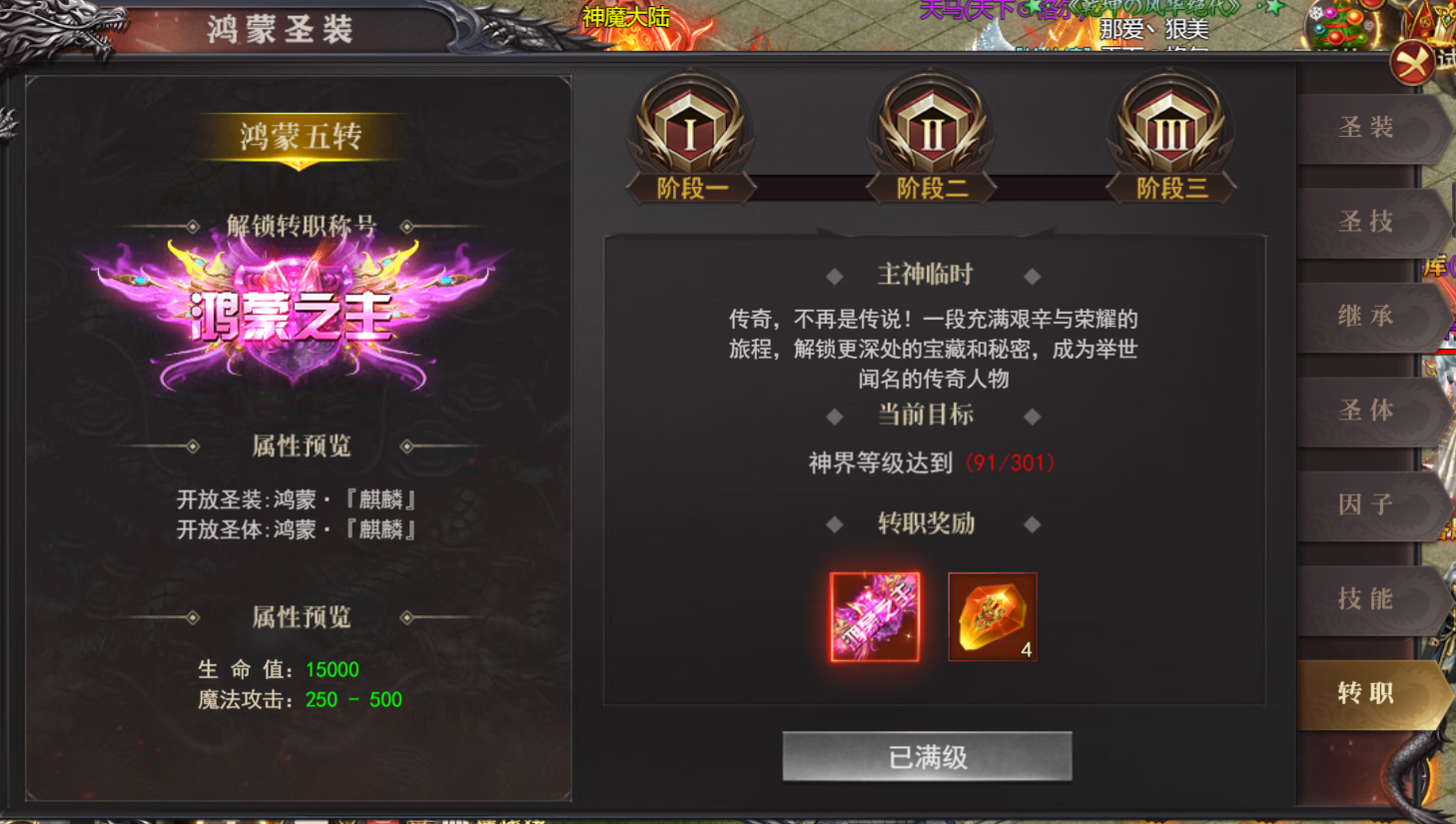 (1)鸿蒙之体转职,满足任务条件转职后可穿戴对应的转职装备
