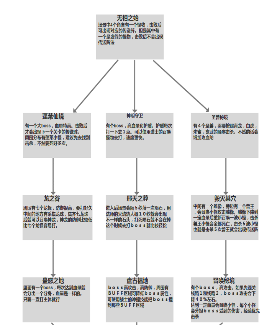 二、3个传送阵对应3条线路,3条线路最终都通往最后的关卡相由心生,通关最后关卡即可完成副本,我们可以只走一条线路直达最后一关,也可以把3条线路都走过了在完成最后一关,每多通过一条线路可额外获得勋章奖励的哦。线路总览如下,每一关卡后面有详细具体的说明。