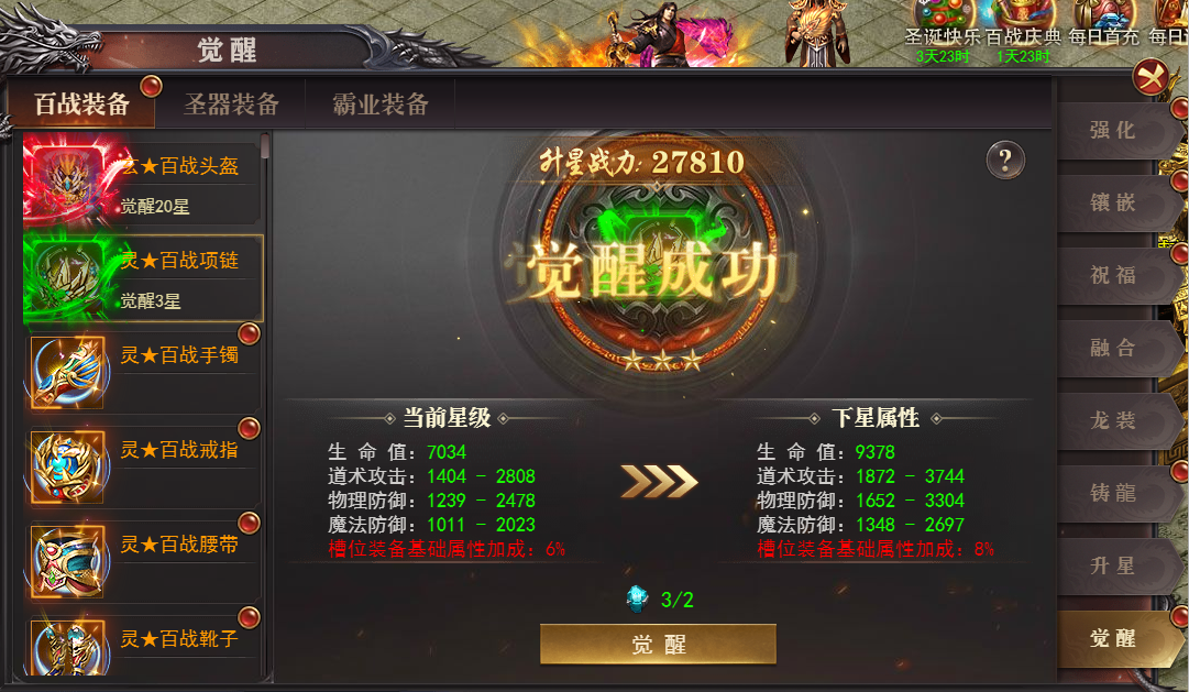 1、 百战装备、圣器和霸业装备开放觉醒,开服达到一定天数可以觉醒相关装备