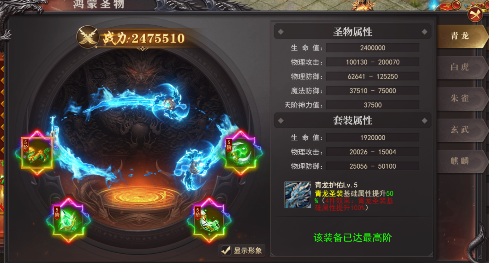 (1)套装类型:青龙、白虎、朱雀、玄武、麒麟