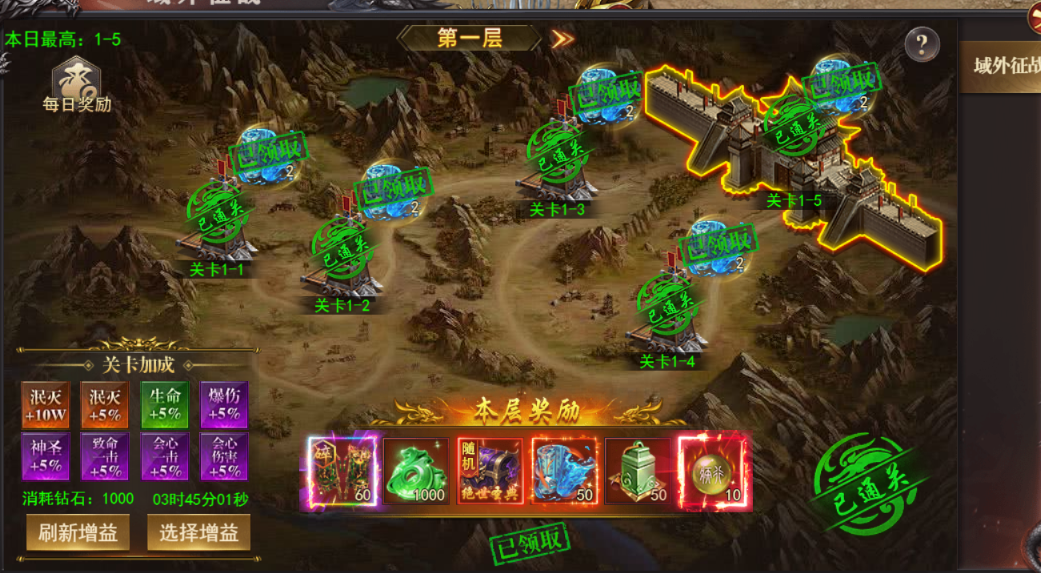 ①域外征战为个人副本,一共有20层,每层有5个关卡