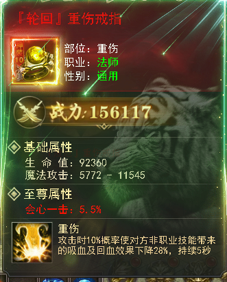 重伤特戒:攻击时10%概率重伤目标,降低敌方吸血和回血百分比(对道士技能无效),持续5秒,升级提升降低效果