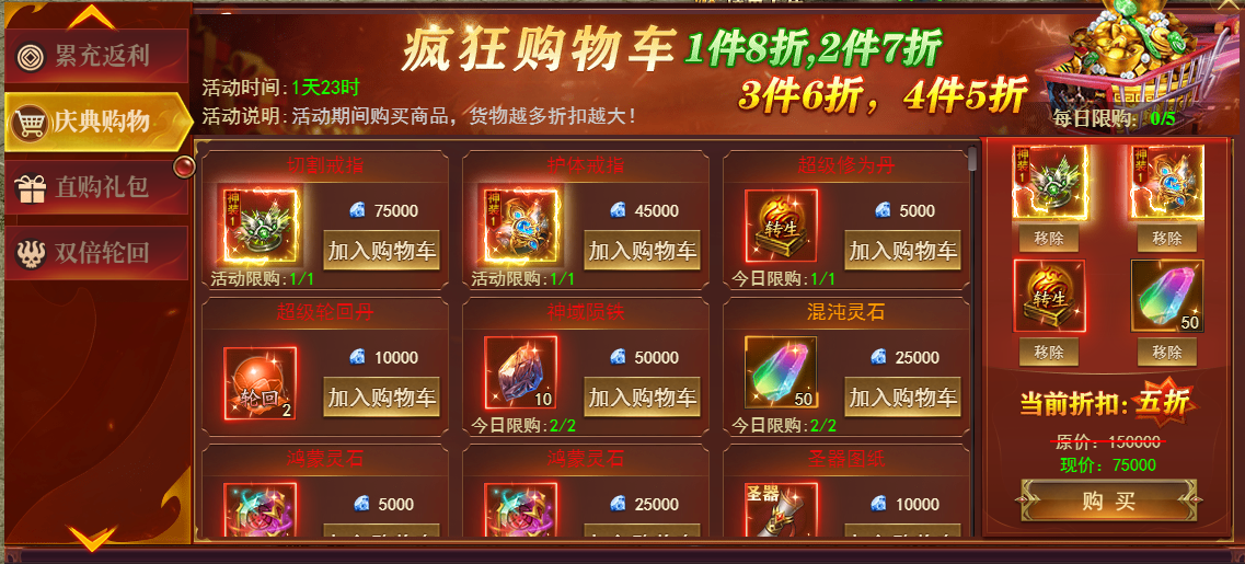 活动期间购买商品,货物越多折扣越大:1件8折、2件7折、3件6折、4件5折,每日限购5次