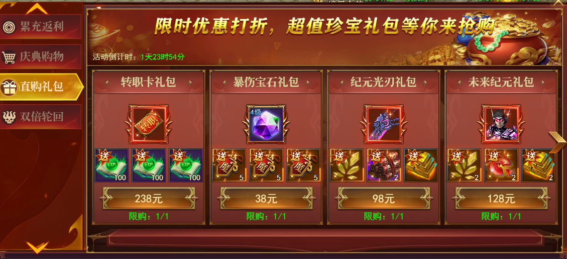 活动期间开启直购礼包,礼包有多个,可左右滑动购买,具体礼包以游戏内实际内容为准