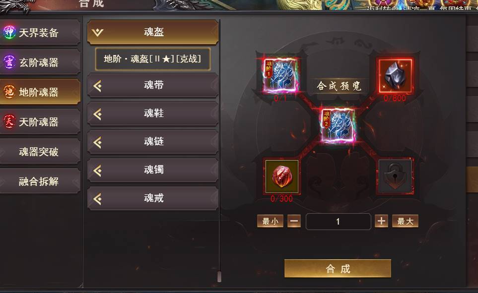 使用地阶魂器[Ⅳ★]和魂器材料进行合成,消耗装备必须为同一克制职业装备,例如地阶●魂盔[Ⅳ★][克道]*2,可提升克制三个不同职业的附加属性,且附带更高至尊属性:天阶神力值,天阶神抗值