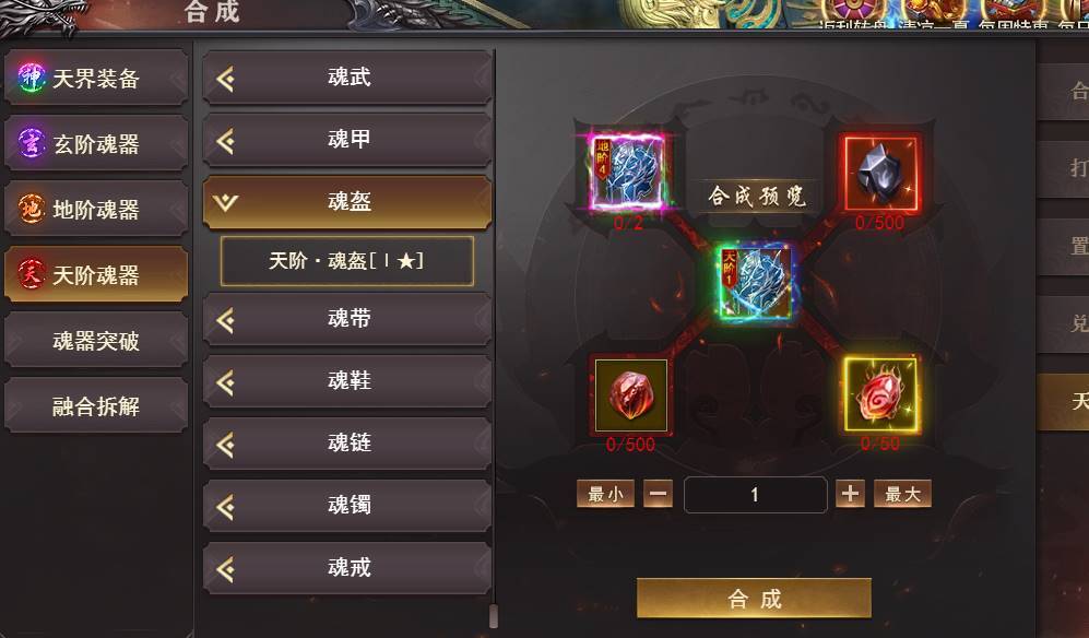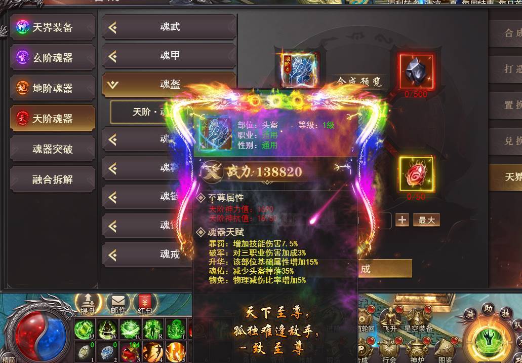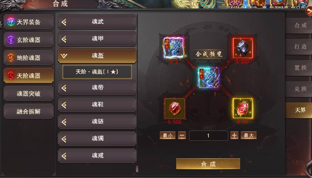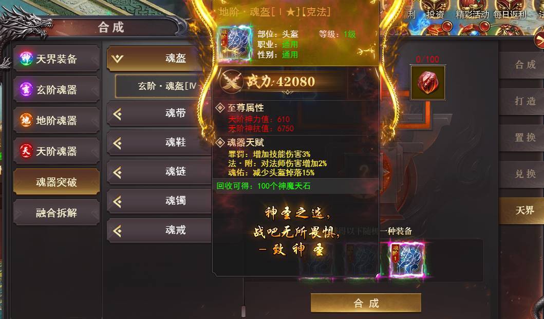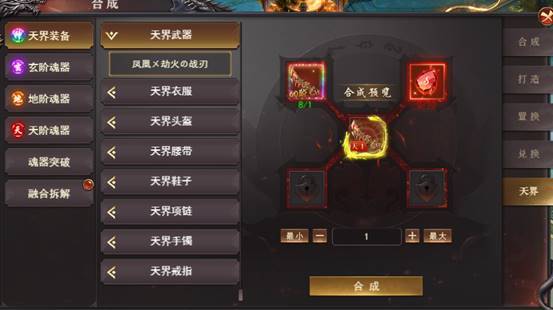 点击天界主城npc装备飞升或者是合成-天界页面,可使用对应的魂器装备部位和魂器材料进行合成升阶至下一阶,提升对应魂器装备属性(魂之结晶+神魔天石可通过击杀神兽boss。凌霄天界概率掉落)