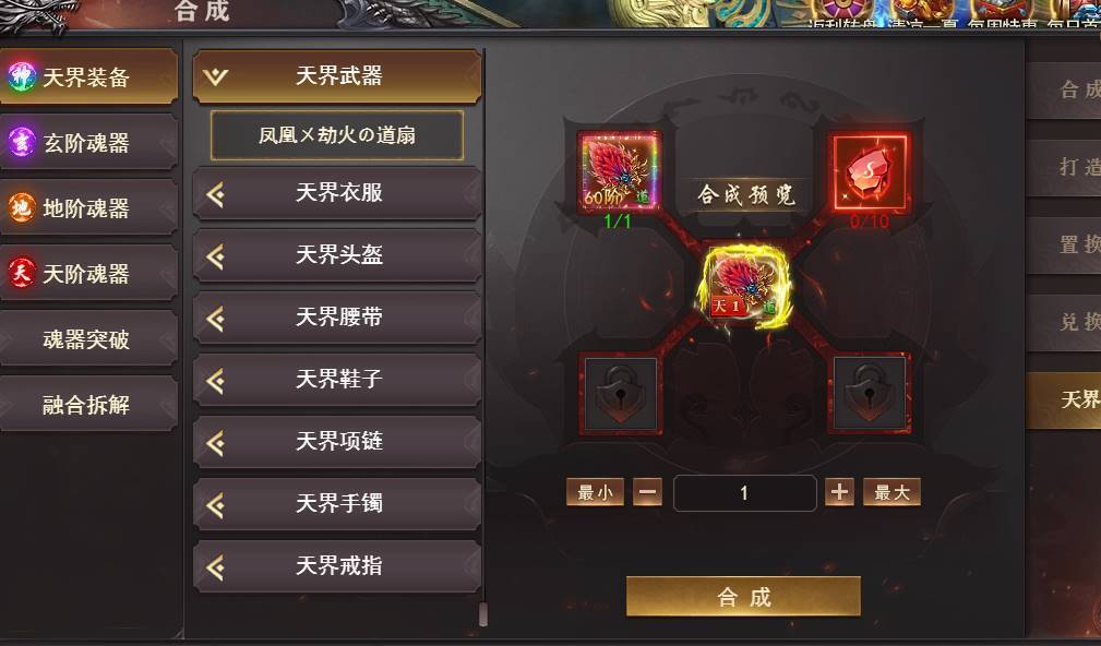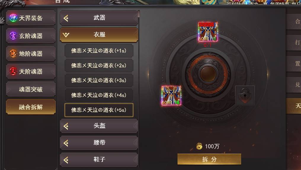 考虑到各位玩家目前已经融合成为S+装备,故我们这边开放对应60阶融合装备拆解,可花费金币进行拆解,拆解之后即可使用对应装备+材料进行天界装备合成