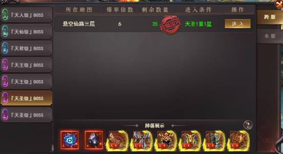(1).共有4个界,10倍爆率地图,分别为青龙界、白虎界、朱雀界、玄武界,需分别达到指定天阶等级及开服天数才可进入;