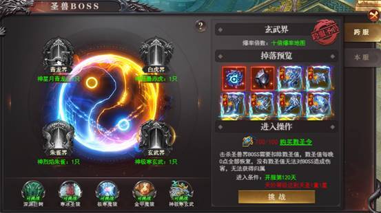 (2).击杀圣兽界BOSS需要扣除10点天界戮圣令,每界有1只终极BOSS,击杀终极BOSS,扣除20点天界戮圣令,戮圣令不足时,无法对boss造成伤害,无法获取奖励,戮圣值每日凌晨0点刷新,也可以通过购买戮圣令增加天界戮圣值,本服圣兽界和跨服圣兽界共享天界戮圣值;