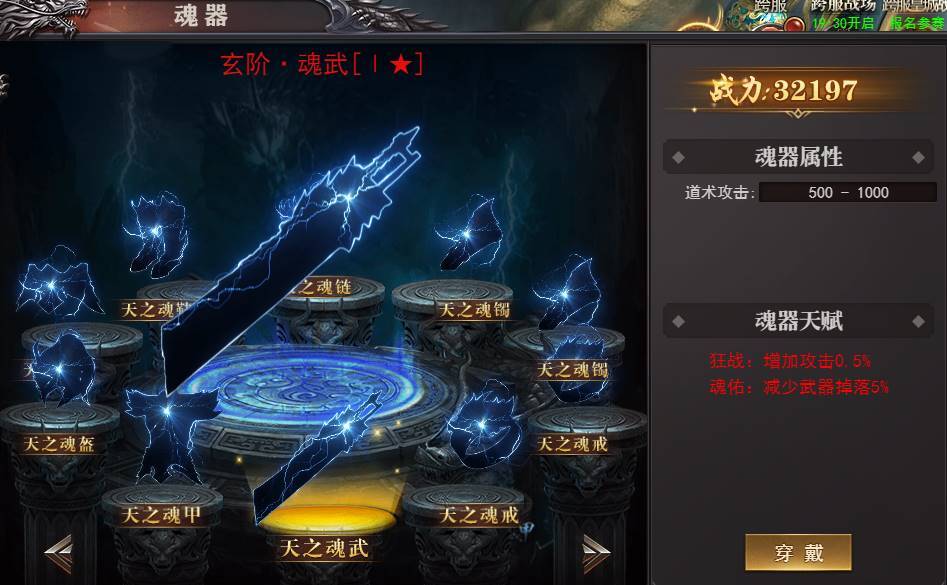 玄阶●魂武[Ⅰ★]魂器天赋:狂战:增加攻击0.5%;魂佑:减少武器掉落5%